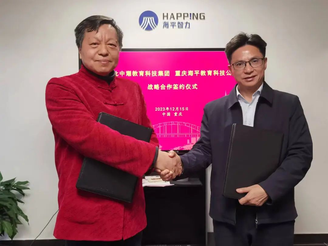 中潮教育董事长汪军民与海平教育董事长杨友明分别代表双方签署了战略合作协议。双方将在企业教育方面发挥各自的优势,共同打造特色化重庆市企业职业教育综合服务体系,为重庆市及相关地区企业提供教育技术、教育服务、教育补贴等综合性服务。
